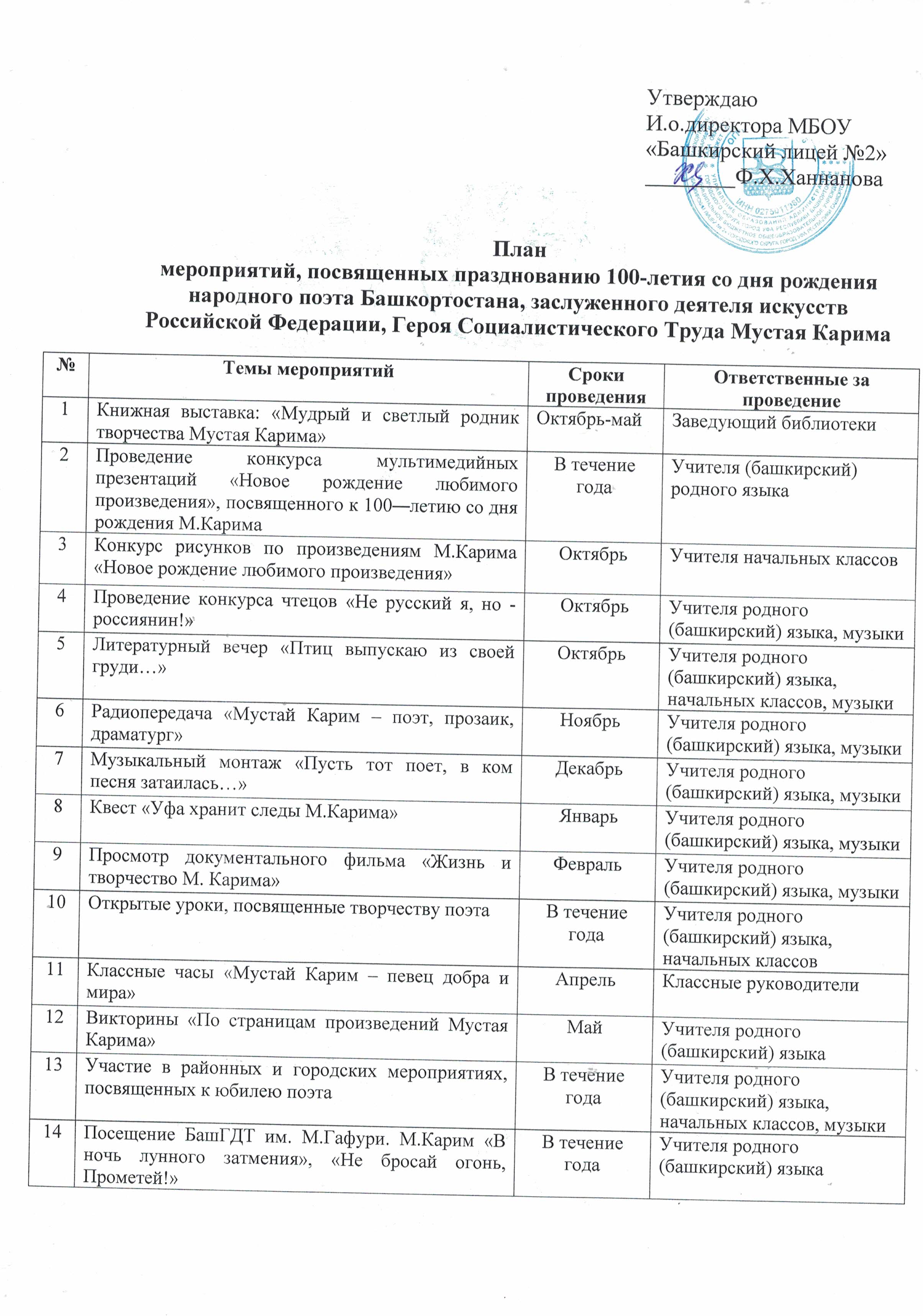 С 22 по 27 октября в Башкирском лицее №2 прошла неделя башкирского языка, посвященная 100-летию поэта и писателя Мустая Карима. Цель, проведенных мероприятий - создание психологических условий, способствующих развитию творческой активности, развитие мотивированного интереса к изучению родных языков, воспитание дружественных отношений среди сверстников, расширение страноведческого кругозора. Студенты практиканты факультета башкирской филологии БГПУ им.Акмуллы помогли учителям организовать множество мероприятий, где школьники смогли проявить себя: конкурс рисунков, викторина, конкурс чтецов, квест и др.